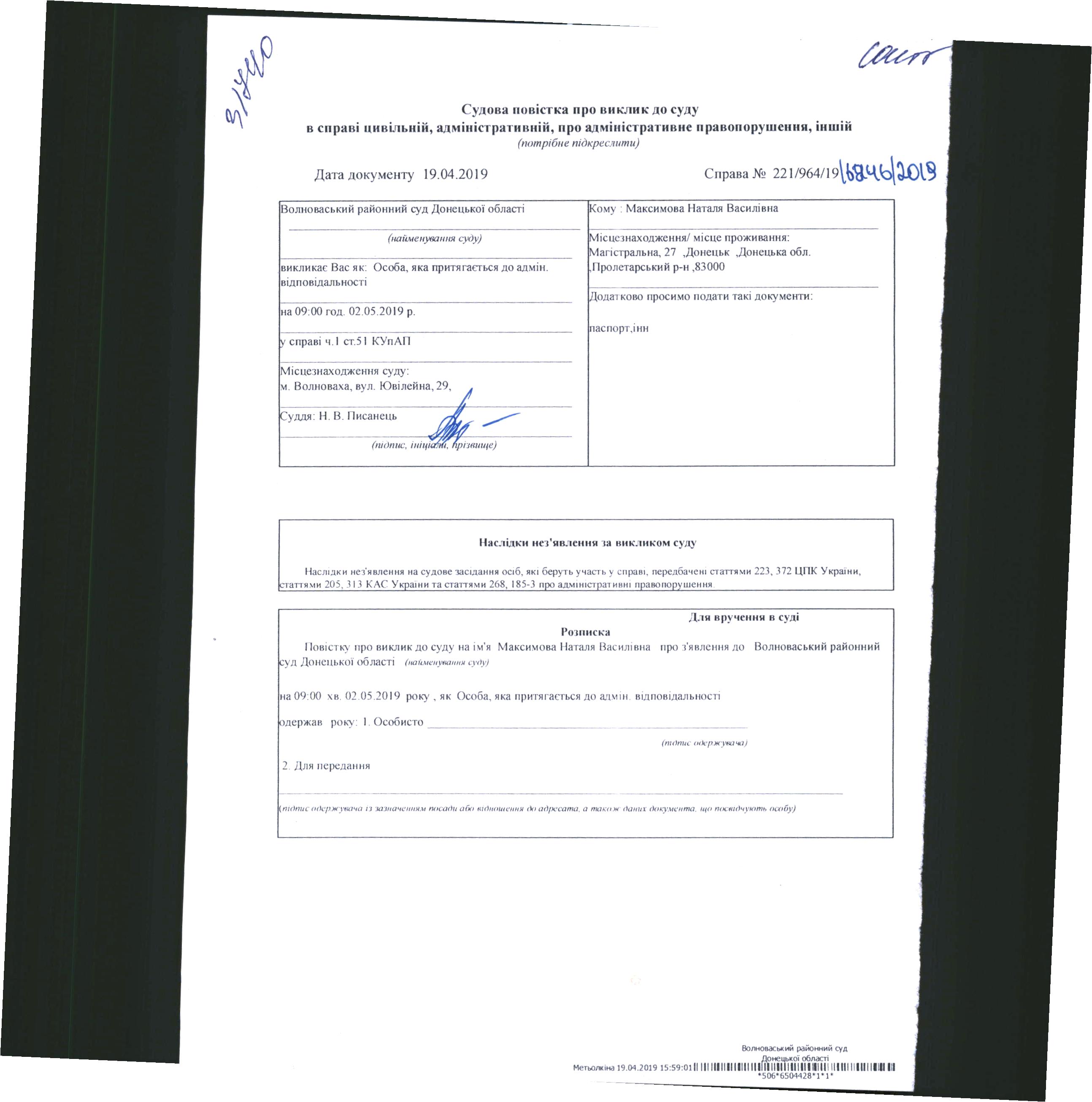 Судова повістка Максимова Нкаталья Василівна по справі 221/964/19