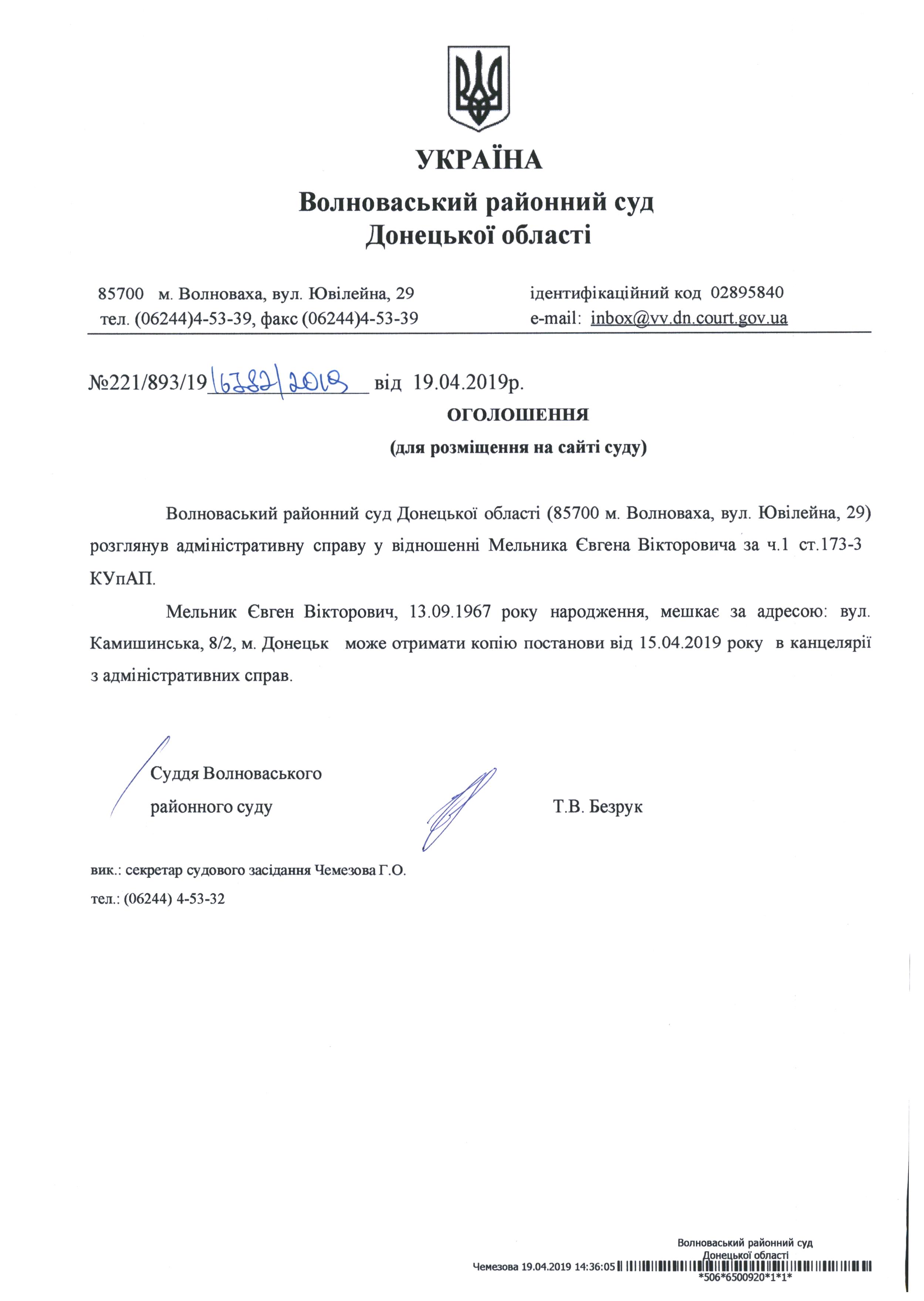 Оголошення для Мельник Євген Вікторович по справі 221/893/19