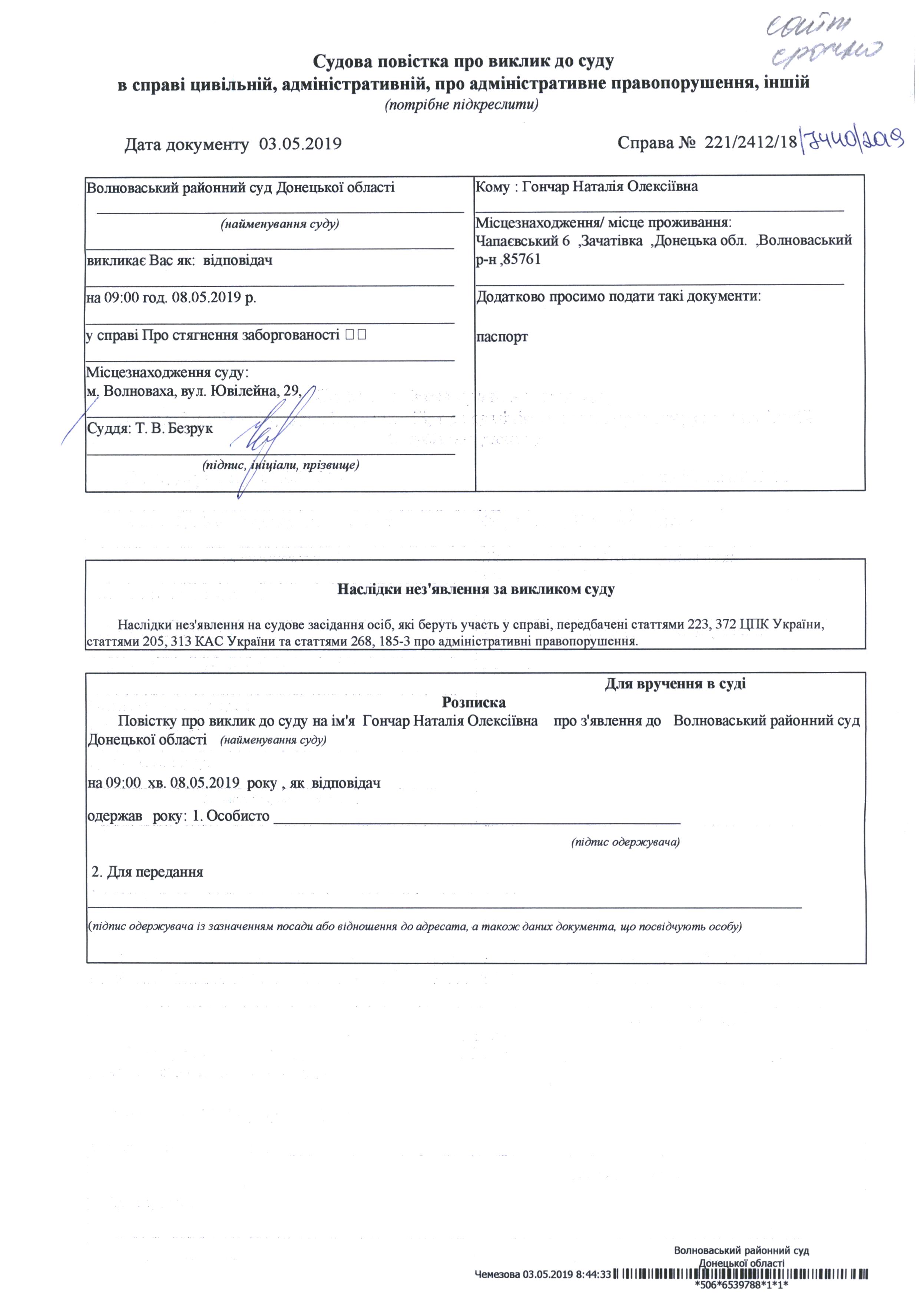 Судова повістка Гончар Наталія Олексіївна по справі 221/2412/18