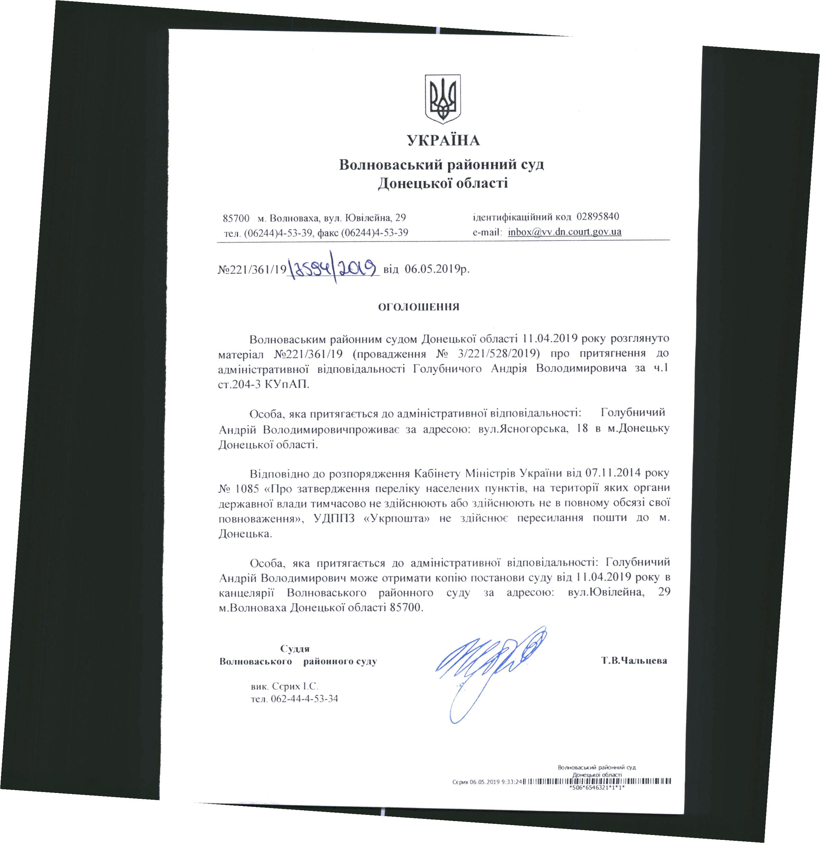 Оголошення для Голубничий Андрій Володимирович по справі 221/361/19