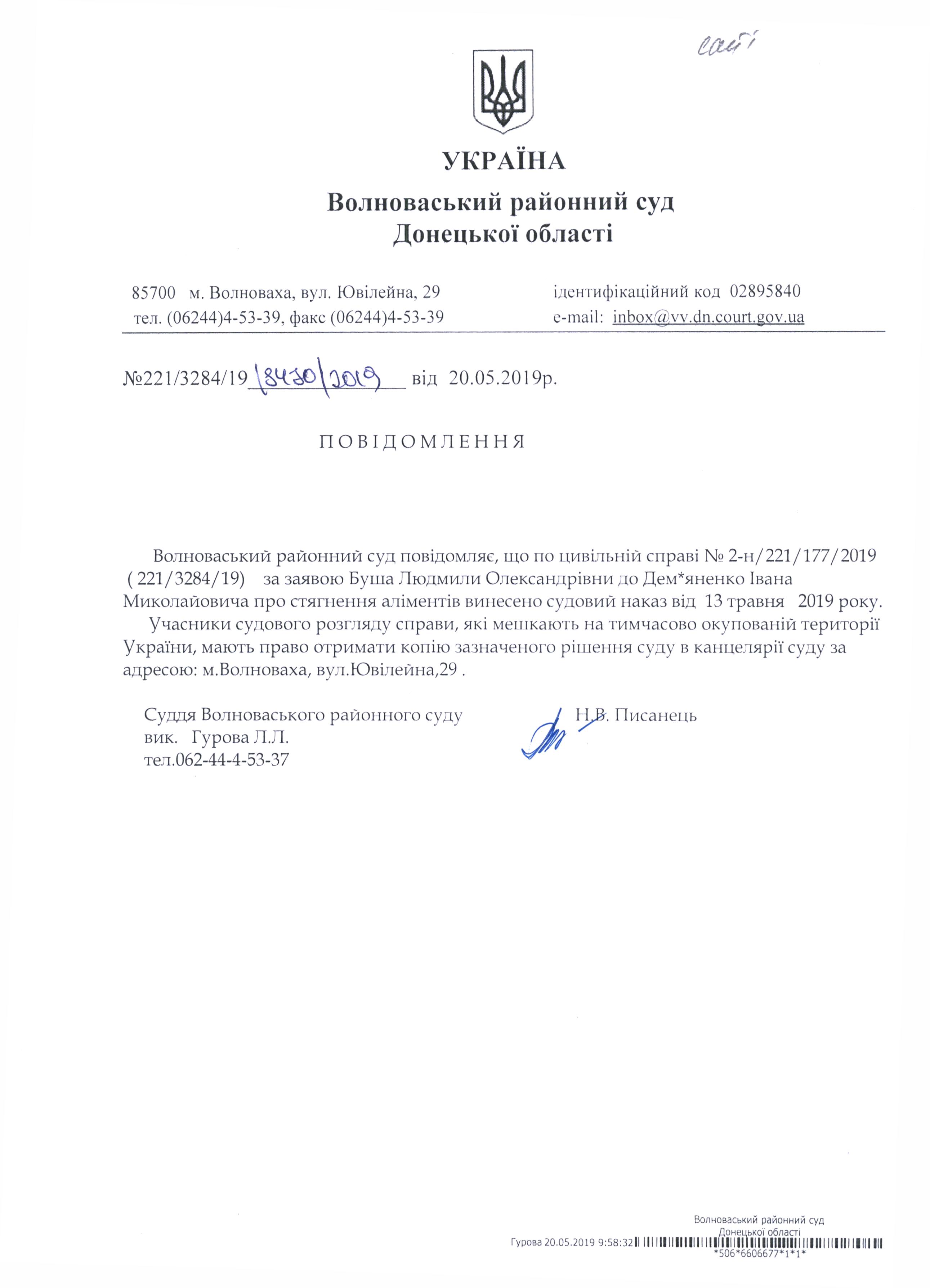 Оголошення для Буша Людмили Олександрівни та Дем яненко Івана Миколайовича по справі 221/3284/19