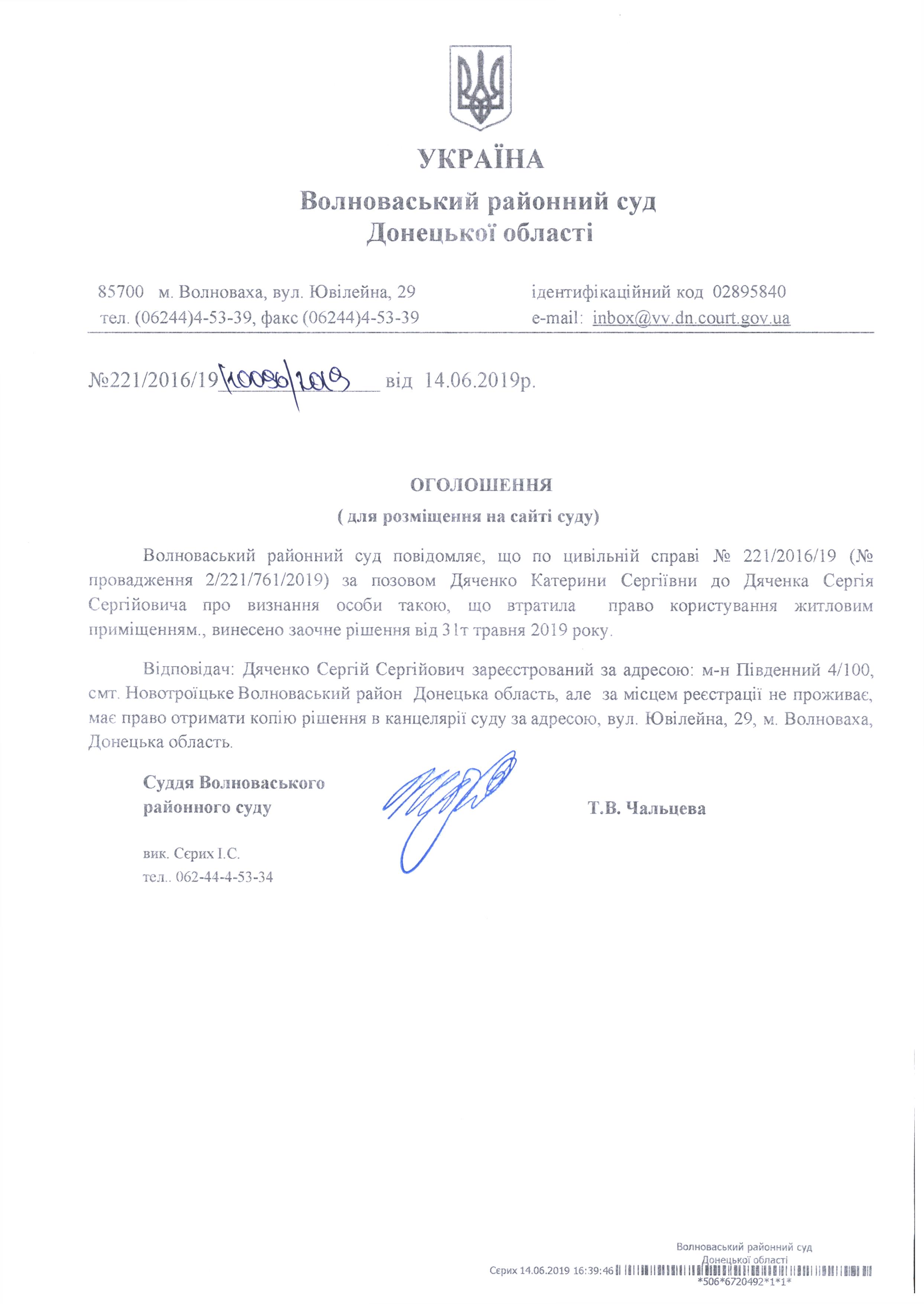 Оголошення для Дяченка Сергія Сергійовича по справі 221/2016/19