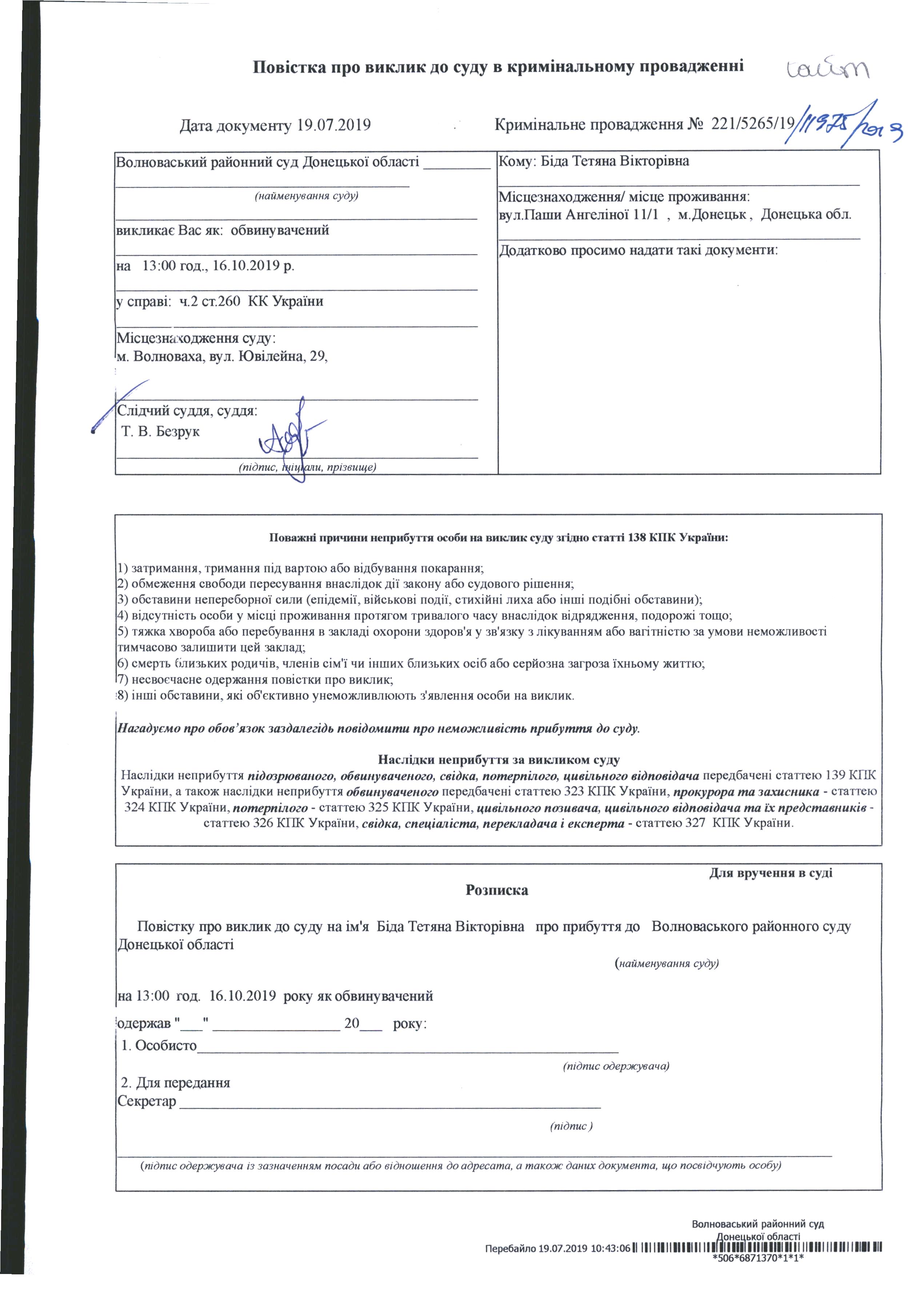 Судова повістка Біда Тетяни Вікторівни по справі 221/5265/19