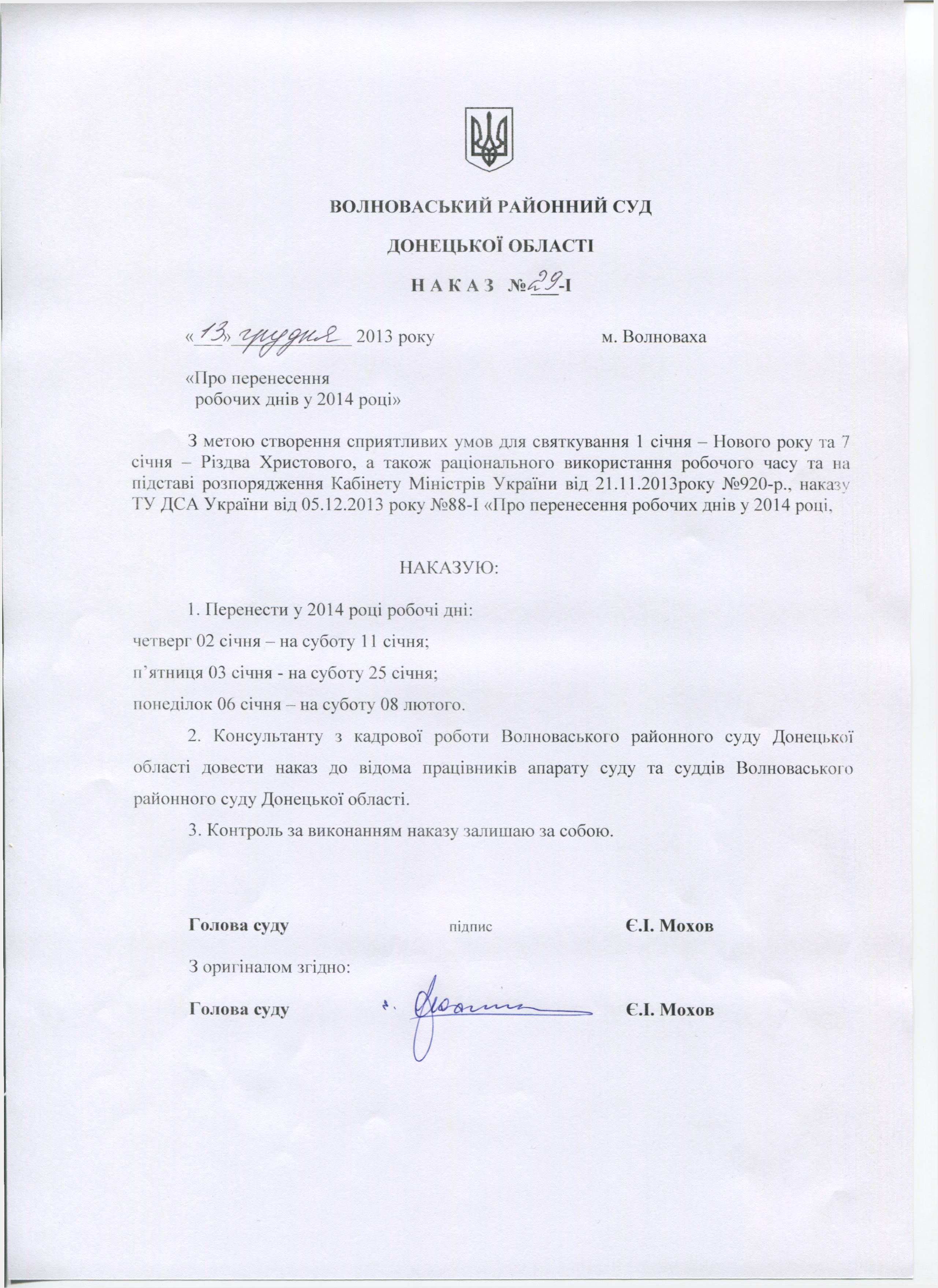 Наказ № 29-І від 13 грудня 2013 року "Про перенесення робочих днів 2,3,6 січня 2014 року".
