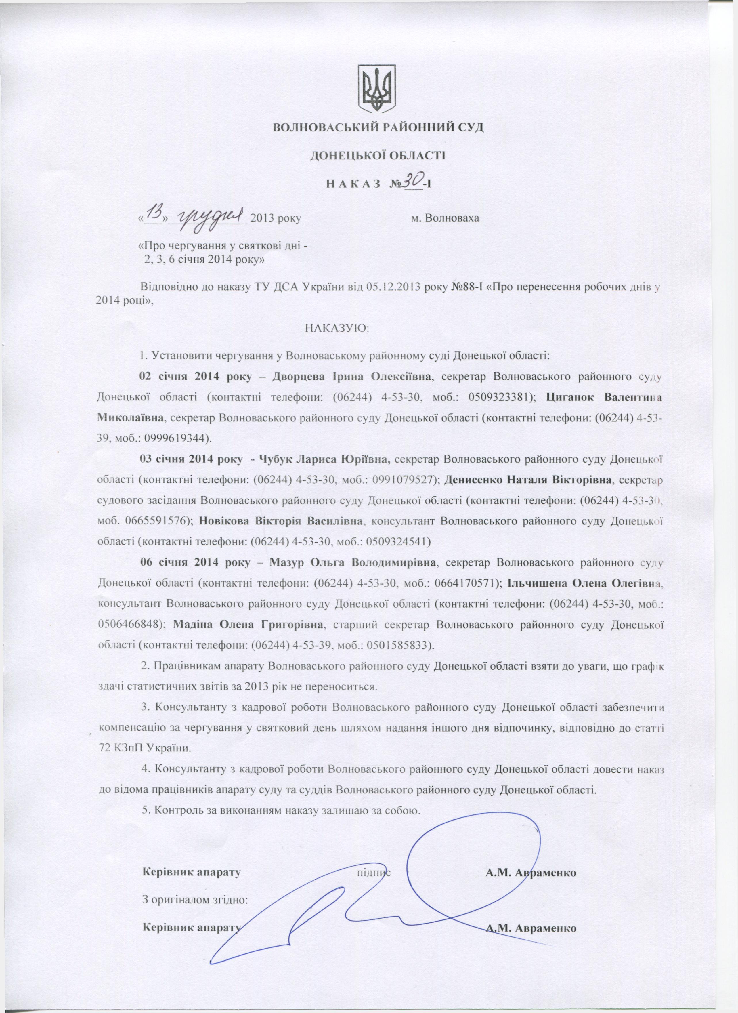 Наказ № 30-І від 13 грудня 2013 року "Про чергування у святкові дні 2,3,6 січня 2014 року".